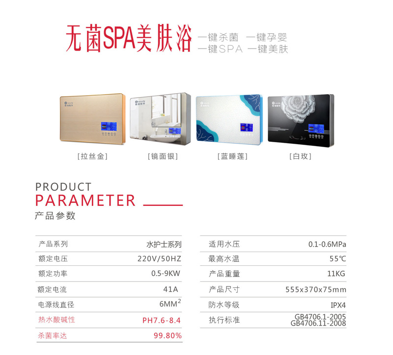 6、磁能熱水器,價(jià)格偏高,對(duì)線徑有要求,安全水電分離,健康, 恒溫,省電。代表品牌“斯瑞斯特”磁能熱水器